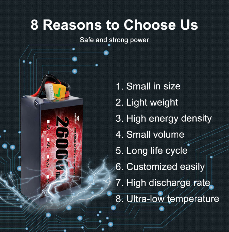 Okoje předním dodavatelem baterií s pevným státem s vysokou energií v Číně, včetně našich Baterie pevného stavu s vysokou energií. Tyto špičkové baterie jsou určeny pro náročné aplikace, od filmu a televize po zemědělské drony, geologické průzkumy a pomoc při katastrofách. Nabízíme kompletní řešení, od vlastního designu a strukturálního inženýrství po konečnou sestavu baterie. Zažijte rozdíl Zye - delší časy, zvýšená bezpečnost a spolehlivá síla pro vaše kritické operace. Zavázali jsme se poskytovat nejkonkurenceschopnější ceny a nabízet přizpůsobení OEM/ODM. Kontaktujte nás ještě dnes s jakýmikoli dotazy!